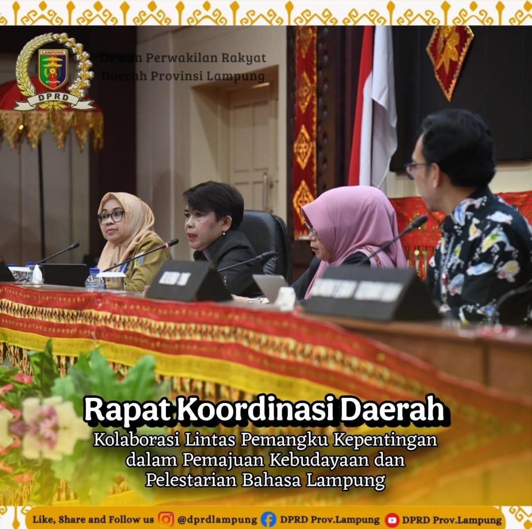 Lampung.IR – Anggota komisi V DPRD provinsi Lampung Ibu Budhi Chondrowati SE., M.Si menjadi Narasumber dalam acara rapat koordinasi daerah dengan tema “Kolaborasi Lintas Pemangku Kepentingan dalam Pemajuan Kebudayaan dan Pelestarian Bahasa Lampung”.