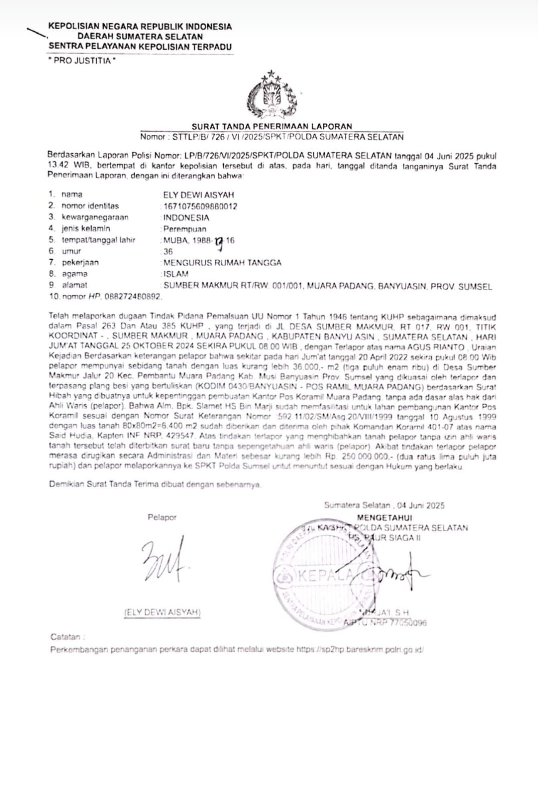 Ely seorang ibu rumah tangga yang melaporkan AR oknum anggota DPRD Banyuasin dipolda Sumsel pada tanggal 4 Juni 2025, dengan nomor LP/B/726/VI/2025/SPKT/POLDA SUMATERA SELATAN. Meradang ketika tau tanah yang menjadi objek pelaporan ada yang melakukan aktivitas di dalamnya. “Saya baru tau tadi pagi ketika saya lewat ke pasar tanah tersebut kok ada bekas aktivitas (diterbas),” ujar Ely.