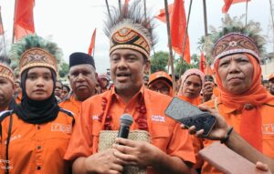 Presiden Partai Buruh, Ir. H. Said Iqbal, S.T., M.E. dalam konferensi pers di arena Kampanye Nasional Partai Buruh di Stadion 16 november Kabupaten Fakfak Papua Barat, selasa (6/2), menyinggung petani Pala yang miskin akibat harga komoditas unggulan itu, dikendalikan kelompok pengusaha serakah.