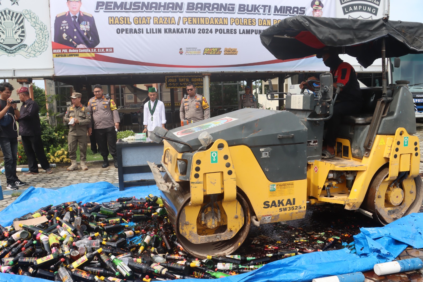 Prosesi pemusnahan miras dilakukan secara simbolis dengan melibatkan sejumlah pihak, termasuk Forkopimda, ormas, dan mahasiswa. Mereka secara bergantian memecahkan botol-botol miras tersebut dengan cara membenturkannya ke roda alat berat jenis roller. Setelah itu, alat berat tersebut maju mundur untuk melindas sisa botol hingga hancur sepenuhnya.