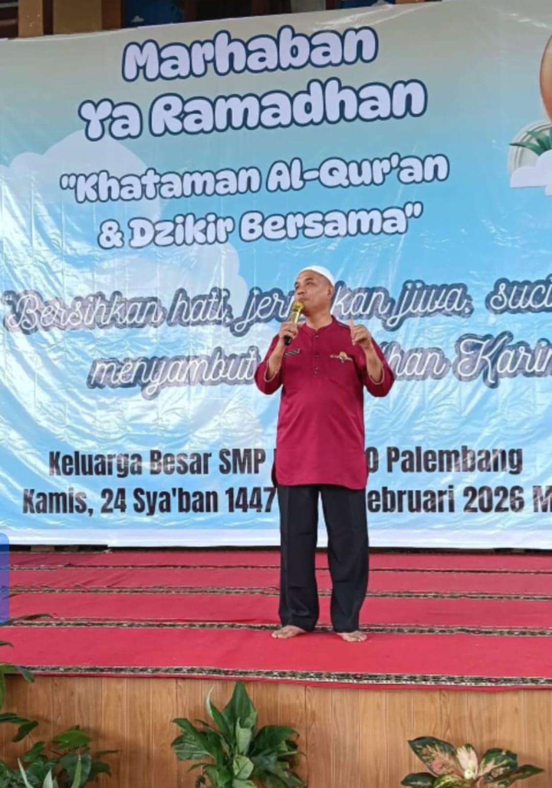 ‎Kepala Sekolah SMPN 10 Palembang, H. Sirajuddin S.Ag.,M.Pd.I menyampaikan bahwa pada hari ini adalah melaksanakan kegiatan Khataman Al-Qur'an dalam rangka menyambut Bulan Suci Ramadhan 1447 H / 2026 M yang dilanjutkan dengan ceramah agama oleh Ustadz H. Dasran Effendi LC.,M.Ag.,CDAI. Kegiatan ini dilaksanakan sebagai bentuk pembinaan keimanan dan ketakwaan kepada Allah SWT bagi seluruh warga sekolah.